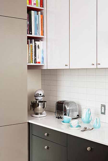 小編的話:一些空隙也不容錯(cuò)過(guò),柜子之間,柜子與家具之間等所留下的空隙,可以定制擱架(擱架裝修效果圖),增添額外收納領(lǐng)域,像案例中這樣,放入一些烹飪書籍,你也可以放上其他雜物。
