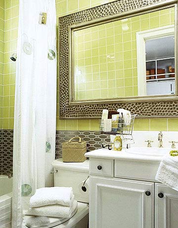 方方正正的綠色墻磚給這個小小的衛(wèi)浴間帶來一絲春風(fēng),鑲以大大的鏡框做裝飾,給衛(wèi)浴間來點不規(guī)則感。白色的衛(wèi)浴柜,白色的浴缸,與綠色搭配起來既經(jīng)典又清新。