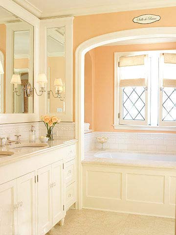 淡淡的橙色墻面將整個衛(wèi)浴間的氣氛也渲染的淡淡的,不仔細看還以為窗戶下是個小休息臺呢,原來是浴缸的位置。米白色的浴室柜,米色的地轉(zhuǎn),精致的燈具,以及鏡子中的幻影,讓整個空間展現(xiàn)出不一樣的宮廷味道。