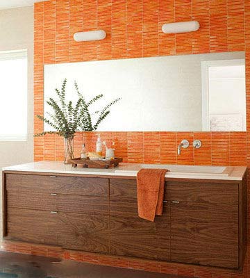桔紅色的背景讓整個墻面組成了一幅有趣的畫,兩只個性的燈具成了眼睛,大大的鏡子成了嘴巴,一眼望過去像正咧著嘴開懷大笑的動畫人物。深橡木色的浴室柜配以跳躍的桔紅色墻面,浴室環(huán)境既活潑又沉穩(wěn)、低調(diào)。
