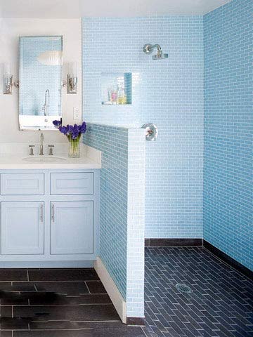 淋浴區(qū)全部采用相同尺寸的藍色墻磚拼貼,工整中打破了白色衛(wèi)浴間的單調(diào)。墻面上摳出一塊四方形的小小的儲物空間,將必需的沐浴用品擱置于此。