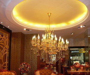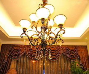 這類型的歐式古典吊燈的設計靈感來源于歐洲古時人們的燭臺照明方式,那時人們都是在懸掛的鐵藝上放置數(shù)根蠟燭。如今,許多的歐式古典吊燈都是由此設計而來,就連照明光源都是蠟燭狀,光源下來垂吊著的水晶在燈光的照射下褶褶生輝,盡顯高貴、奢華之氣質。